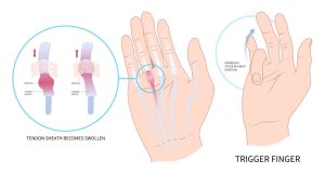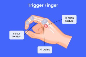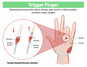 ट्रिगर फिंगर किंवा स्टेनोसिंग टेनोसायनोव्हायटिस ही बोटातील कंडरा (tendon) आणि त्याच्या भोवती असलेल्या कवचात होणारी सूज किंवा जाडीमुळे निर्माण होणारी एक सामान्य समस्या आहे. या विकारात बोट वाकवताना किंवा सरळ करताना “क्लिक” किंवा “टक” असा आवाज/अडथळा जाणवतो. कधी कधी बोट लॉकसारखे अडकून राहते आणि नंतर अचानक सुटते, म्हणून याला “ट्रिगर फिंगर” असे नाव दिले आहे.